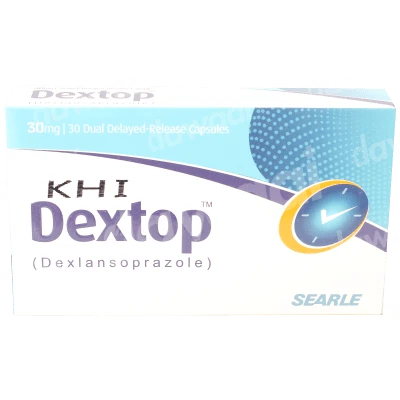 Dextop 30mg capsules contain the active ingredient dexlansoprazole, a proton pump inhibitor (PPI) used to reduce stomach acid production. It is used to treat conditions caused by excessive stomach acid, such as acid reflux and erosive esophagitis. Dextop is manufactured by Searle.